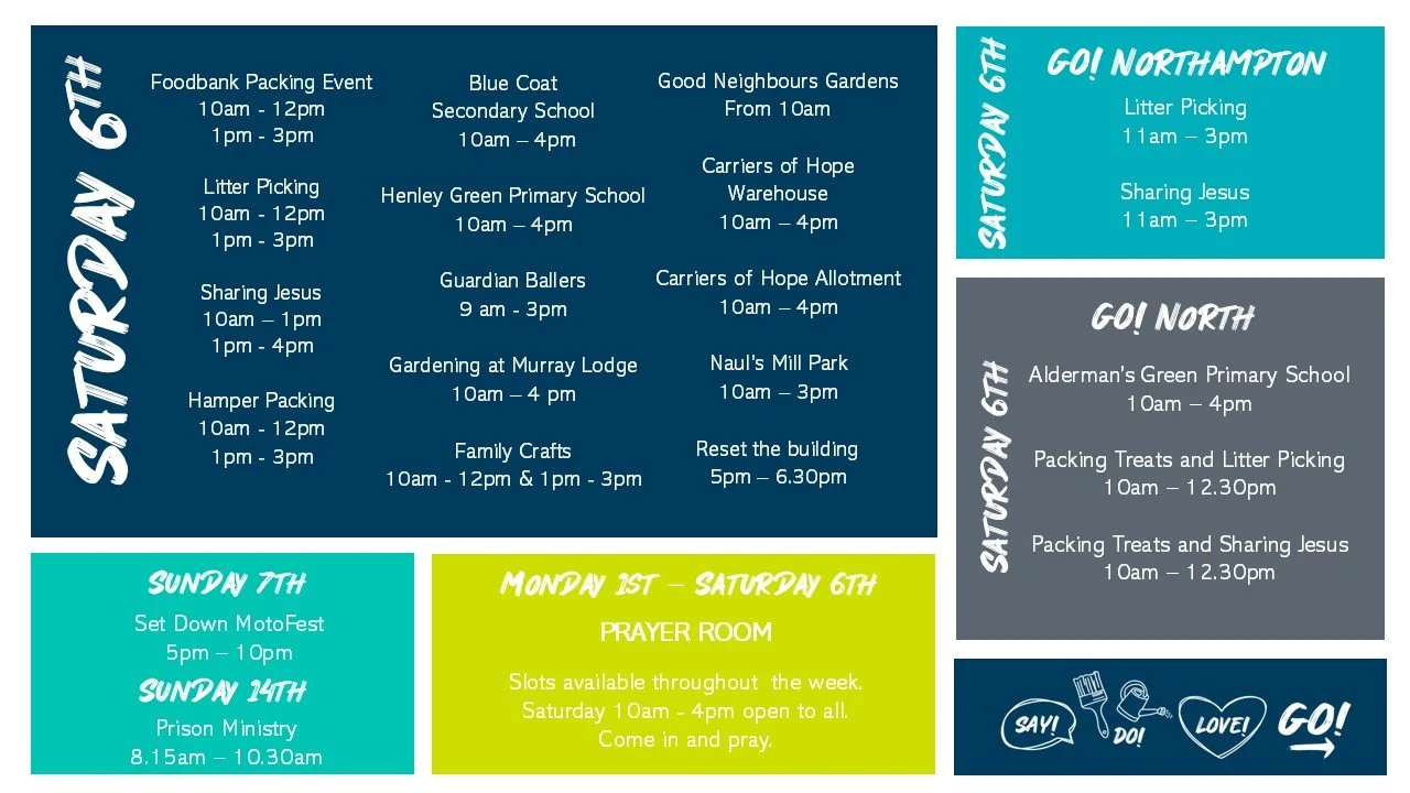 We are believing for the Lord to move in mighty ways during GO! 2026. We have a Prayer Room running across the week. Don’t forget to book a slot and come and soak in His presence and lift the Jesus over Coventry, Northampton and GO! 2026.